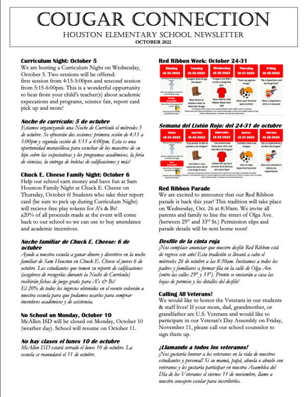 Read the Cougar Connection: Houston Elementary School Newsletter for October 2022!